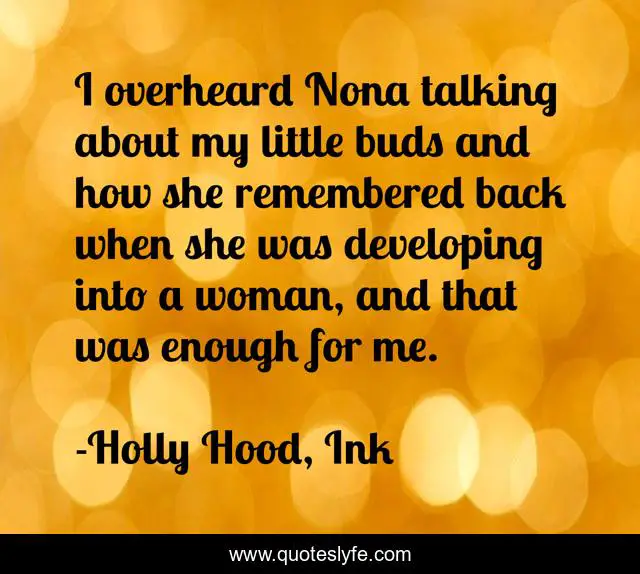 This page presents the quote "I overheard Nona talking about my little buds and how she remembered back when she was developing into a woman, and that was enough for me.". Author of this quote is Holly Hood, Ink. This quote is about funny, embarassing, girls, comedy,.
