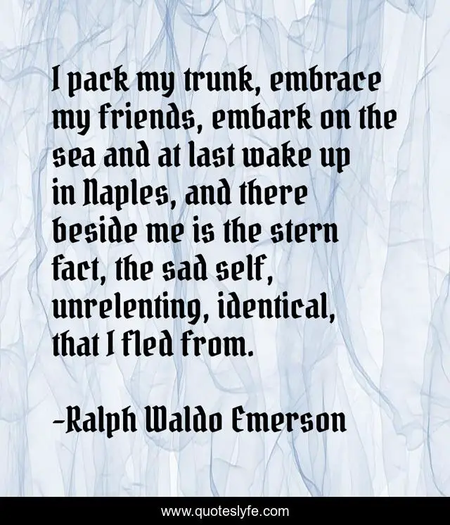 This page presents the quote "I pack my trunk, embrace my friends, embark on the sea and at last wake up in Naples, and there beside me is the stern fact, the sad self, unrelenting, identical, that I fled from.". Author of this quote is Ralph Waldo Emerson. .