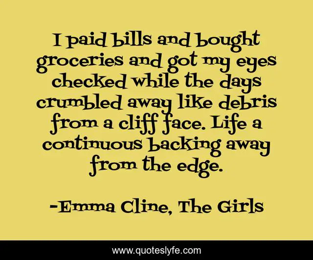 This page presents the quote "I paid bills and bought groceries and got my eyes checked while the days crumbled away like debris from a cliff face. Life a continuous backing away from the edge.". Author of this quote is Emma Cline, The Girls. This quote is about aging, remorse, nostalgia, time,.