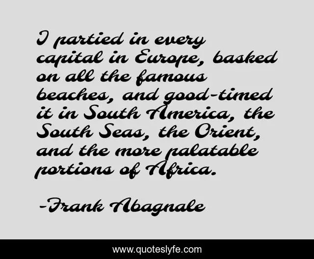 This page presents the quote "I partied in every capital in Europe, basked on all the famous beaches, and good-timed it in South America, the South Seas, the Orient, and the more palatable portions of Africa.". Author of this quote is Frank Abagnale. This quote is about europe, america, africa,.