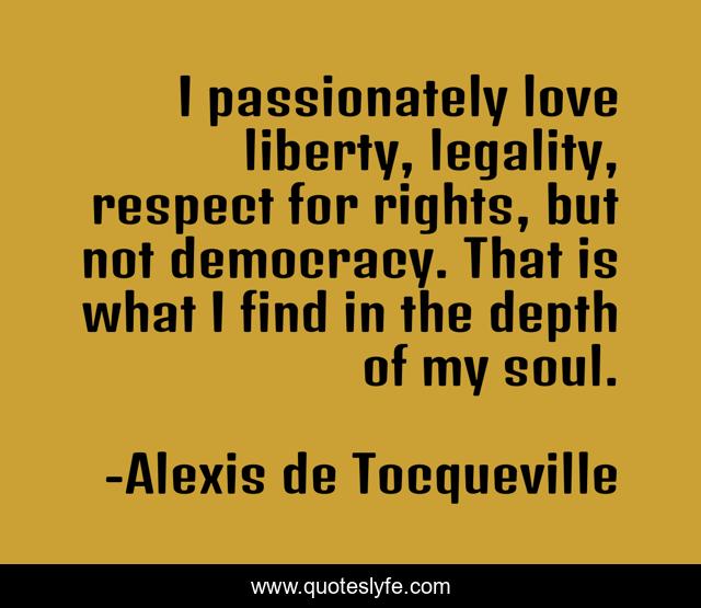 This page presents the quote "I passionately love liberty, legality, respect for rights, but not democracy. That is what I find in the depth of my soul.". Author of this quote is Alexis de Tocqueville. This quote is about legality, liberty, soul, democracy, rights,.
