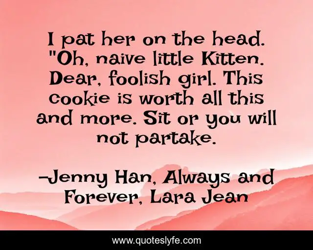 This page presents the quote "I pat her on the head. "Oh, naive little Kitten. Dear, foolish girl. This cookie is worth all this and more. Sit or you will not partake.". Author of this quote is Jenny Han, Always and Forever, Lara Jean. This quote is about food, funny, random, humor, comedy,.