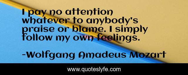 This page presents the quote "I pay no attention whatever to anybody's praise or blame. I simply follow my own feelings.". Author of this quote is Wolfgang Amadeus Mozart. This quote is about criticism, reviews, mozart,.