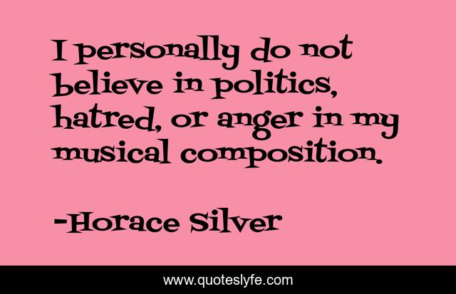 This page presents the quote "I personally do not believe in politics, hatred, or anger in my musical composition.". Author of this quote is Horace Silver. This quote is about politics, hatred, believe,.