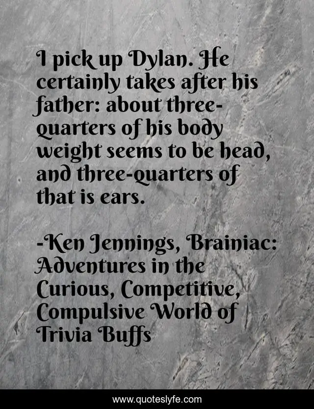 This page presents the quote "I pick up Dylan. He certainly takes after his father: about three-quarters of his body weight seems to be head, and three-quarters of that is ears.". Author of this quote is Ken Jennings, Brainiac: Adventures in the Curious, Competitive, Compulsive World of Trivia Buffs. This quote is about ears, funny, head, comedy, ken-jennings,.