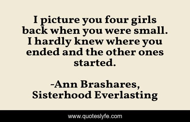 This page presents the quote "I picture you four girls back when you were small. I hardly knew where you ended and the other ones started.". Author of this quote is Ann Brashares, Sisterhood Everlasting. This quote is about small, picture, girls,.