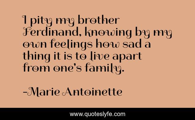 This page presents the quote "I pity my brother Ferdinand, knowing by my own feelings how sad a thing it is to live apart from one's family.". Author of this quote is Marie Antoinette. This quote is about live, brother, family,.