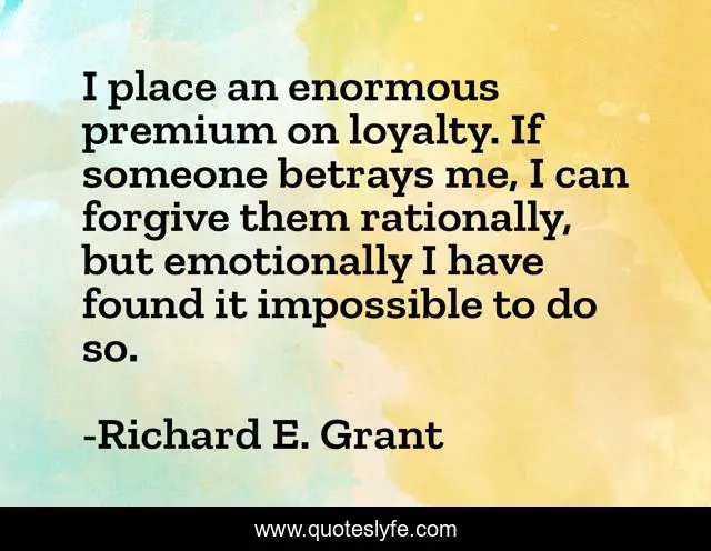 This page presents the quote "I place an enormous premium on loyalty. If someone betrays me, I can forgive them rationally, but emotionally I have found it impossible to do so.". Author of this quote is Richard E. Grant. This quote is about me, impossible, loyalty,.