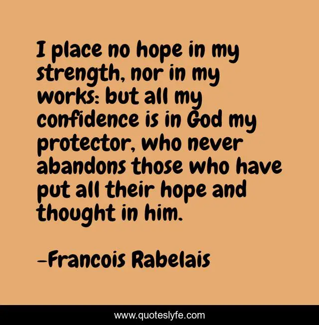 This page presents the quote "I place no hope in my strength, nor in my works: but all my confidence is in God my protector, who never abandons those who have put all their hope and thought in him.". Author of this quote is Francois Rabelais. This quote is about god, confidence, strength,.