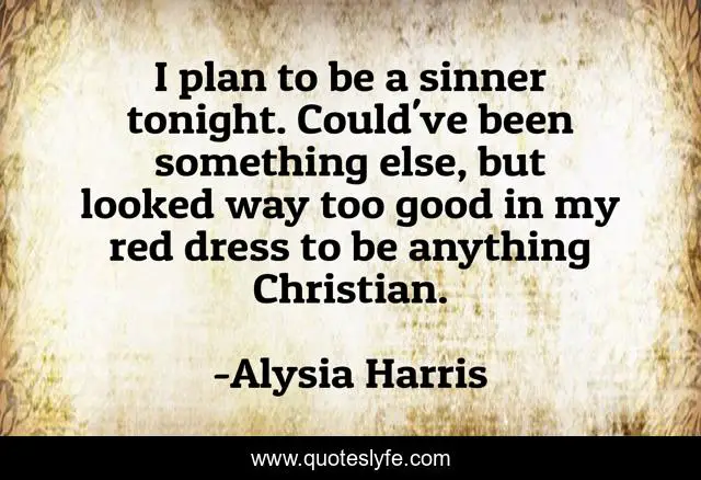 This page presents the quote "I plan to be a sinner tonight. Could've been something else, but looked way too good in my red dress to be anything Christian.". Author of this quote is Alysia Harris. This quote is about poem, christian, poetry, tonight, religion, poet, dress, sin, sinner,.