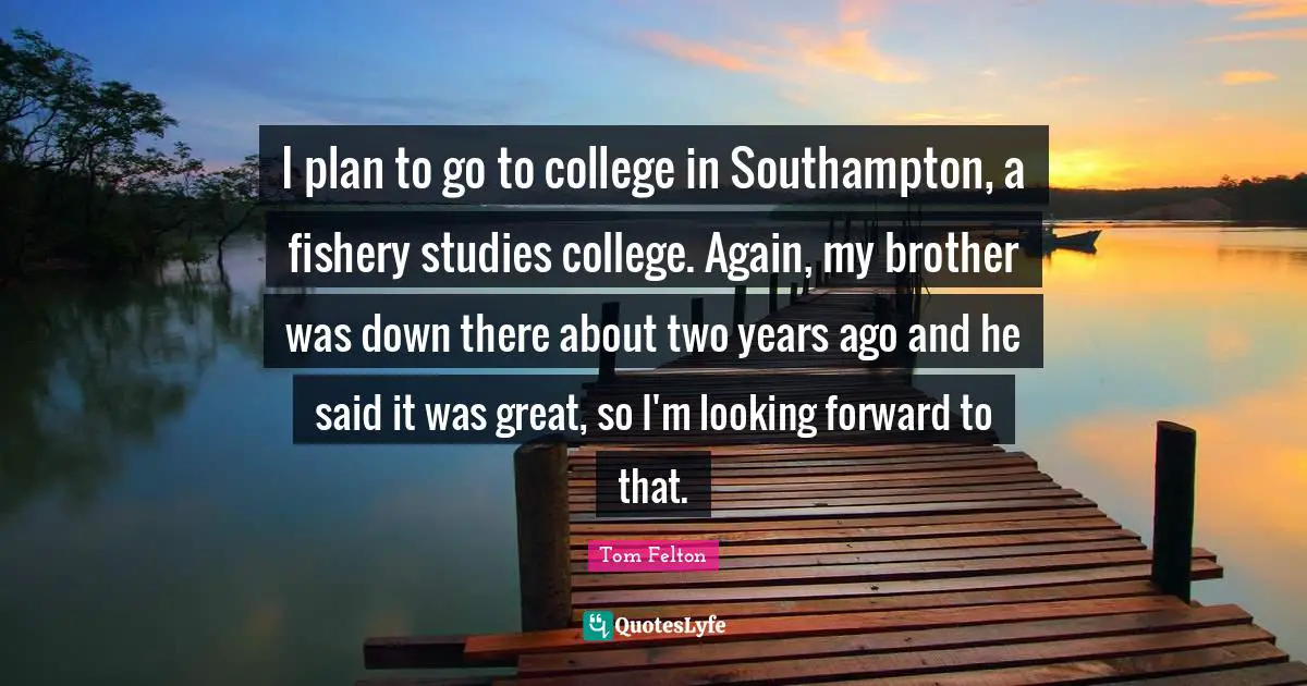 This page presents the quote "I plan to go to college in Southampton, a fishery studies college. Again, my brother was down there about two years ago and he said it was great, so I'm looking forward to that.". Author of this quote is Tom Felton. This quote is about brother, said, southampton, college, my brother, two, two years, looking forward,.