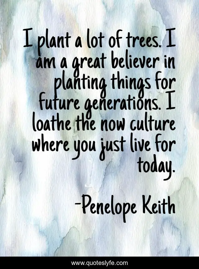 This page presents the quote "I plant a lot of trees. I am a great believer in planting things for future generations. I loathe the now culture where you just live for today.". Author of this quote is Penelope Keith. This quote is about culture, future, today,.