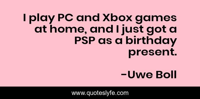 This page presents the quote "I play PC and Xbox games at home, and I just got a PSP as a birthday present.". Author of this quote is Uwe Boll. This quote is about home, play, present,.