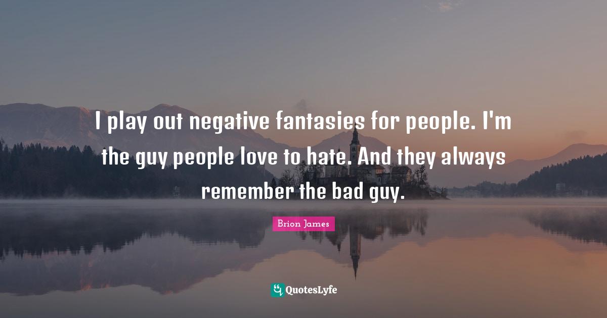 This page presents the quote "I play out negative fantasies for people. I'm the guy people love to hate. And they always remember the bad guy.". Author of this quote is Brion James. This quote is about love, remember, people, guy, play, negative, hate,.