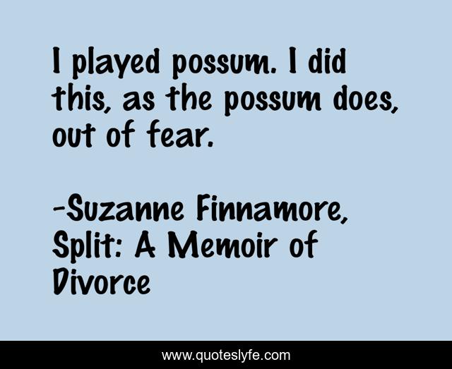 This page presents the quote "I played possum. I did this, as the possum does, out of fear.". Author of this quote is Suzanne Finnamore, Split: A Memoir of Divorce. This quote is about infidelity, cheating, divorce, seperation, marriage, husband,.