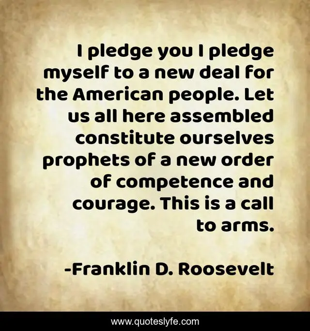 This page presents the quote "I pledge you I pledge myself to a new deal for the American people. Let us all here assembled constitute ourselves prophets of a new order of competence and courage. This is a call to arms.". Author of this quote is Franklin D. Roosevelt. .