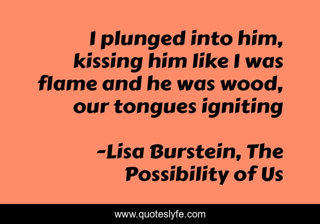 This page presents the quote "I plunged into him, kissing him like I was flame and he was wood, our tongues igniting". Author of this quote is Lisa Burstein, The Possibility of Us. This quote is about new-adult, romance,.