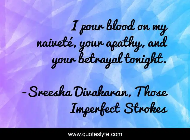 This page presents the quote "I pour blood on my naiveté, your apathy, and your betrayal tonight.". Author of this quote is Sreesha Divakaran, Those Imperfect Strokes. This quote is about letting-go, forgetting, apathy, betrayal, naivete,.