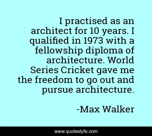 This page presents the quote "I practised as an architect for 10 years. I qualified in 1973 with a fellowship diploma of architecture. World Series Cricket gave me the freedom to go out and pursue architecture.". Author of this quote is Max Walker. This quote is about me, freedom, world,.