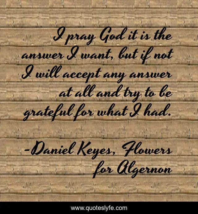 This page presents the quote "I pray God it is the answer I want, but if not I will accept any answer at all and try to be grateful for what I had.". Author of this quote is Daniel Keyes, Flowers for Algernon. This quote is about pray, god, try, answers, grateful,.