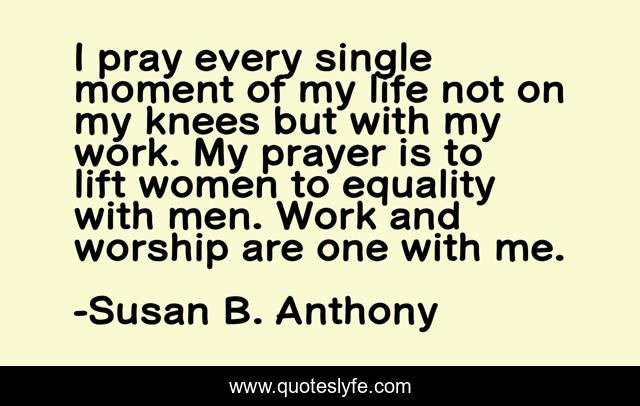 This page presents the quote "I pray every single moment of my life not on my knees but with my work. My prayer is to lift women to equality with men. Work and worship are one with me.". Author of this quote is Susan B. Anthony. This quote is about religion, women-s-history,.