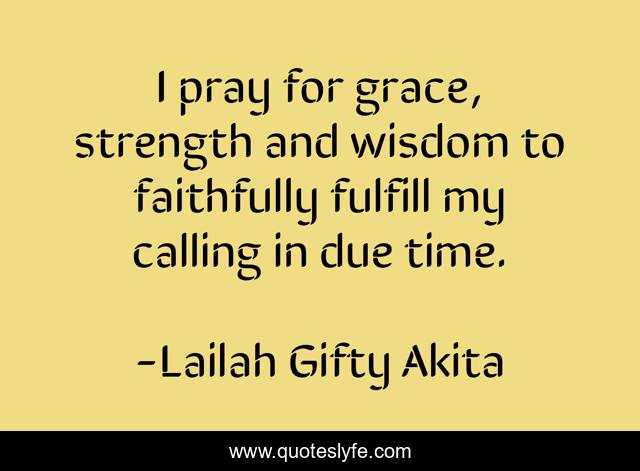 This page presents the quote "I pray for grace, strength and wisdom to faithfully fulfill my calling in due time.". Author of this quote is Lailah Gifty Akita. This quote is about pray, fulfilling-your-destiny, grace, calling,.