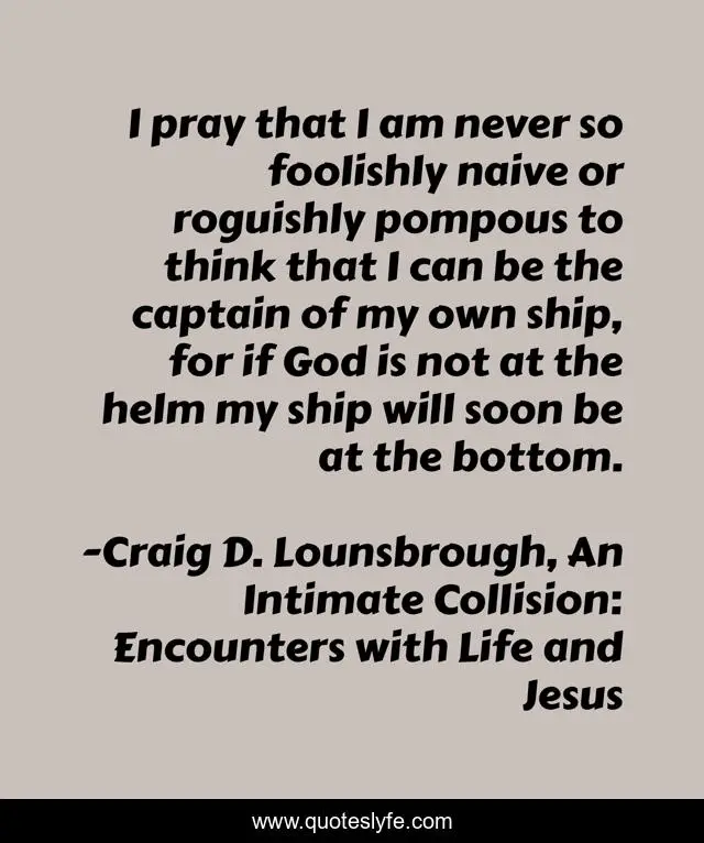 This page presents the quote "I pray that I am never so foolishly naive or roguishly pompous to think that I can be the captain of my own ship, for if God is not at the helm my ship will soon be at the bottom.". Author of this quote is Craig D. Lounsbrough, An Intimate Collision: Encounters with Life and Jesus. This quote is about control, direction, captain, bottom, god, guidance, wisdom, helm, release,.