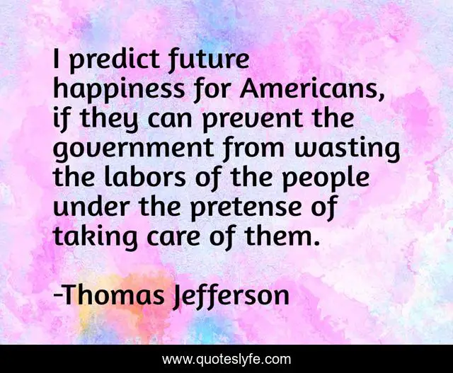 This page presents the quote "I predict future happiness for Americans, if they can prevent the government from wasting the labors of the people under the pretense of taking care of them.". Author of this quote is Thomas Jefferson. This quote is about politics, government, freedom,.