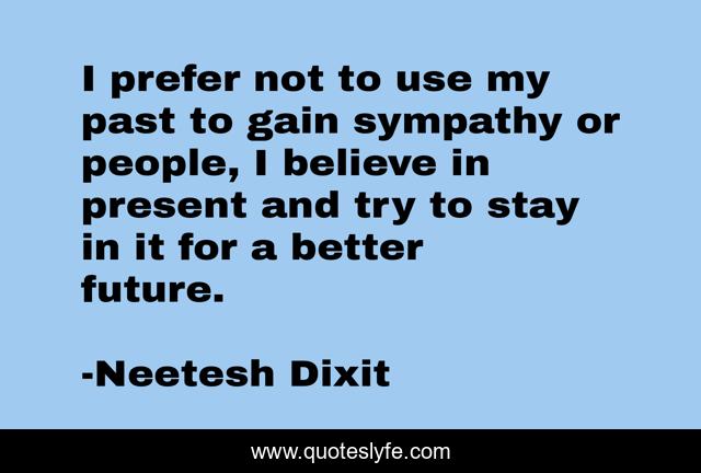 This page presents the quote "I prefer not to use my past to gain sympathy or people, I believe in present and try to stay in it for a better future.". Author of this quote is Neetesh Dixit. This quote is about life, people, emotions, past, future, tomorrow, present,.
