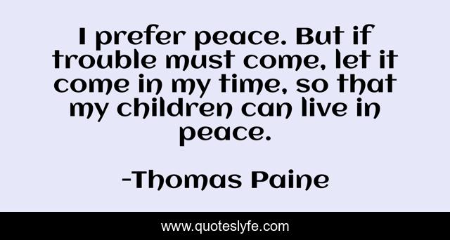 This page presents the quote "I prefer peace. But if trouble must come, let it come in my time, so that my children can live in peace.". Author of this quote is Thomas Paine. This quote is about live, peace, children,.