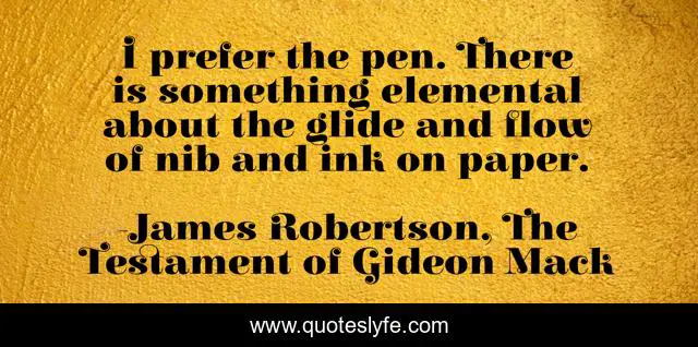 This page presents the quote "I prefer the pen. There is something elemental about the glide and flow of nib and ink on paper.". Author of this quote is James Robertson, The Testament of Gideon Mack. This quote is about pens, nib, writing-process, writing, craft, ink, handwriting,.