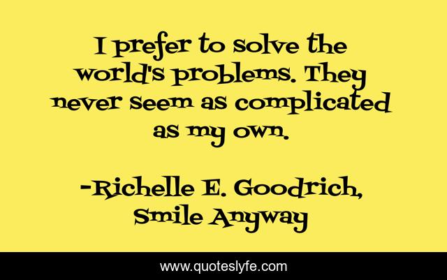 This page presents the quote "I prefer to solve the world's problems. They never seem as complicated as my own.". Author of this quote is Richelle E. Goodrich, Smile Anyway. This quote is about world-problems, problems-in-the-world, problems, difficulties, richelle, richelle-goodrich, personal-problems,.