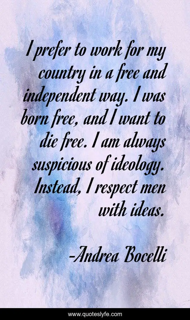 This page presents the quote "I prefer to work for my country in a free and independent way. I was born free, and I want to die free. I am always suspicious of ideology. Instead, I respect men with ideas.". Author of this quote is Andrea Bocelli. This quote is about work, men,.