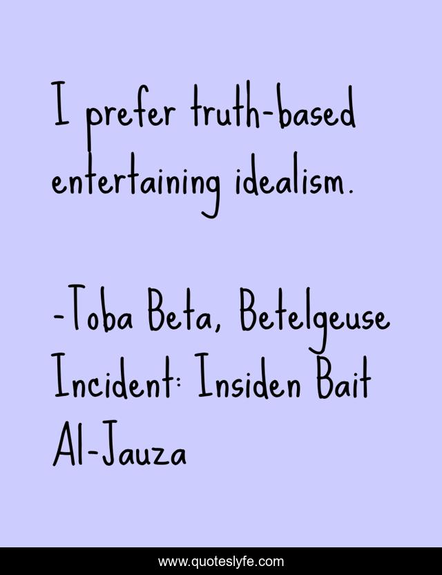 This page presents the quote "I prefer truth-based entertaining idealism.". Author of this quote is Toba Beta, Betelgeuse Incident: Insiden Bait Al-Jauza. This quote is about idealism, truth, entertainment,.