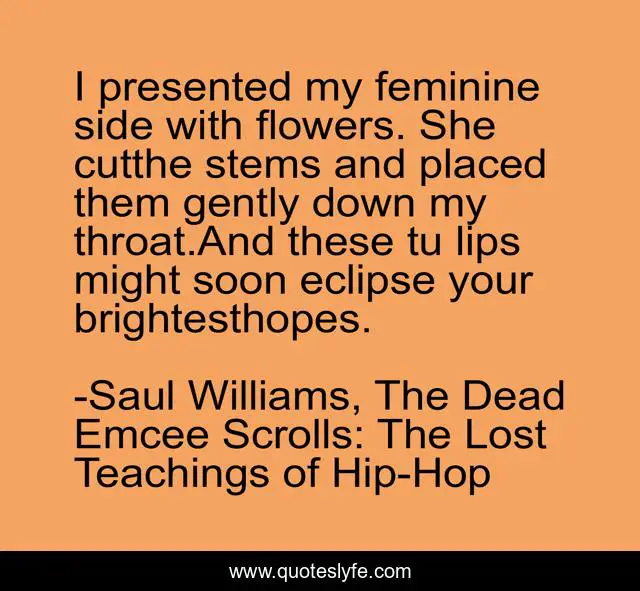 This page presents the quote "I presented my feminine side with flowers. She cutthe stems and placed them gently down my throat.And these tu lips might soon eclipse your brightesthopes.". Author of this quote is Saul Williams, The Dead Emcee Scrolls: The Lost Teachings of Hip-Hop. This quote is about hopes, flowers,.