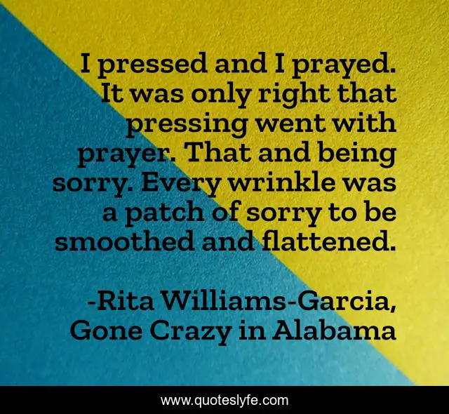 This page presents the quote "I pressed and I prayed. It was only right that pressing went with prayer. That and being sorry. Every wrinkle was a patch of sorry to be smoothed and flattened.". Author of this quote is Rita Williams-Garcia, Gone Crazy in Alabama. This quote is about ironing, forgiveness, prayer,.