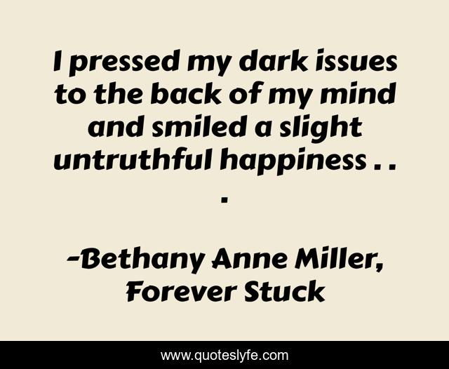 This page presents the quote "I pressed my dark issues to the back of my mind and smiled a slight untruthful happiness . . .". Author of this quote is Bethany Anne Miller, Forever Stuck. This quote is about smiles, darkness, light, problems, worried, issues, friendship, happiness,.