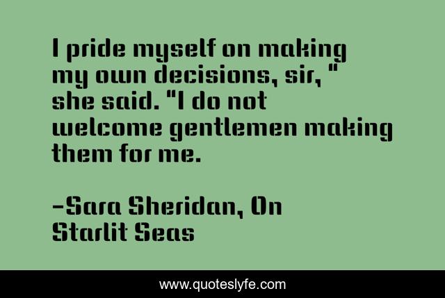 This page presents the quote "I pride myself on making my own decisions, sir, " she said. "I do not welcome gentlemen making them for me.". Author of this quote is Sara Sheridan, On Starlit Seas. This quote is about confidence, strong-female-characters, inspiring,.