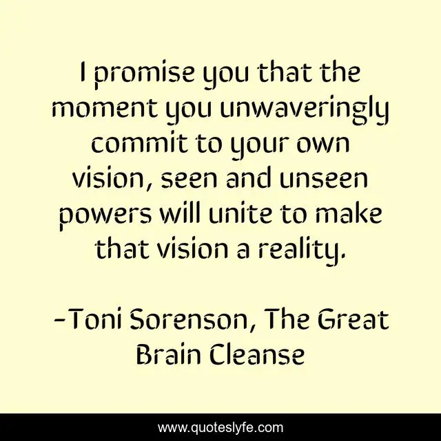 This page presents the quote "I promise you that the moment you unwaveringly commit to your own vision, seen and unseen powers will unite to make that vision a reality.". Author of this quote is Toni Sorenson, The Great Brain Cleanse. This quote is about brain, life, support, motivation, inspiration,.