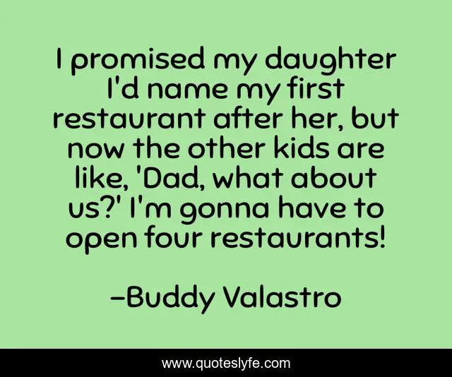 This page presents the quote "I promised my daughter I'd name my first restaurant after her, but now the other kids are like, 'Dad, what about us?' I'm gonna have to open four restaurants!". Author of this quote is Buddy Valastro. This quote is about daughter, name, restaurant,.