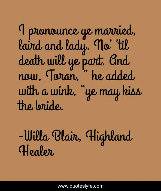 This page presents the quote "I pronounce ye married, laird and lady. No’ ’til death will ye part. And now, Toran, ” he added with a wink, “ye may kiss the bride.". Author of this quote is Willa Blair, Highland Healer. This quote is about romance, highland-romance, highland-healer, historical-romance, scottish-romance,.