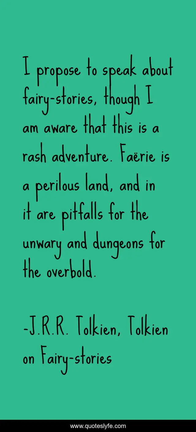 This page presents the quote "I propose to speak about fairy-stories, though I am aware that this is a rash adventure. Faërie is a perilous land, and in it are pitfalls for the unwary and dungeons for the overbold.". Author of this quote is J.R.R. Tolkien, Tolkien on Fairy-stories. This quote is about fantasy, epic-fantasy, fantasy-fiction, worldbuilding,.