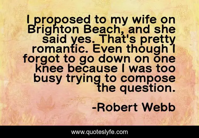 This page presents the quote "I proposed to my wife on Brighton Beach, and she said yes. That's pretty romantic. Even though I forgot to go down on one knee because I was too busy trying to compose the question.". Author of this quote is Robert Webb. This quote is about busy, beach, wife,.