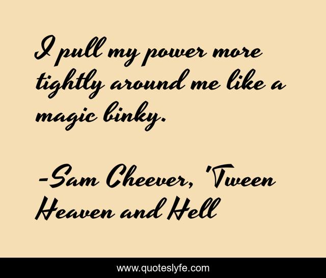 This page presents the quote "I pull my power more tightly around me like a magic binky.". Author of this quote is Sam Cheever, 'Tween Heaven and Hell. This quote is about humor, magic, power,.