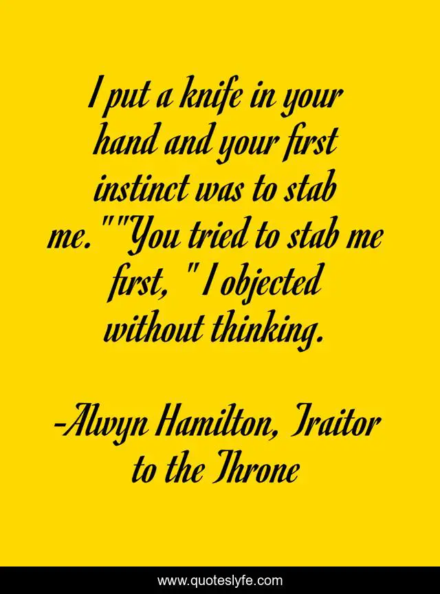 This page presents the quote "I put a knife in your hand and your first instinct was to stab me.""You tried to stab me first, " I objected without thinking.". Author of this quote is Alwyn Hamilton, Traitor to the Throne. This quote is about amani, comedy, traitor-to-the-throne, funny,.