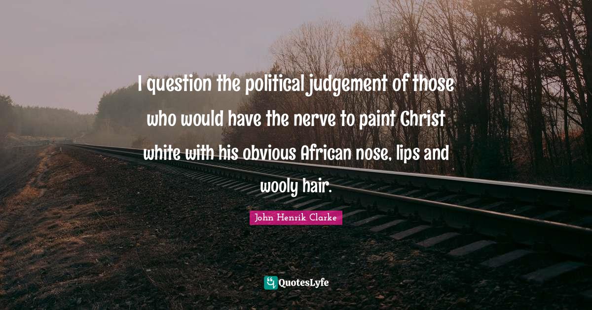 This page presents the quote "I question the political judgement of those who would have the nerve to paint Christ white with his obvious African nose, lips and wooly hair.". Author of this quote is John Henrik Clarke. This quote is about hair, white, paint, christ, judgement, lips, obvious, political,.