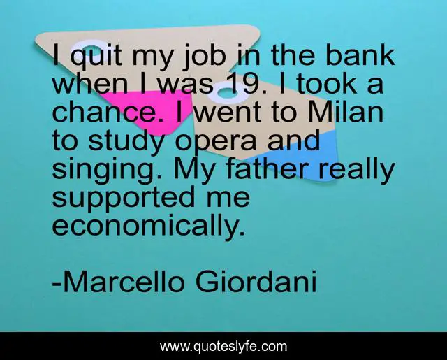 This page presents the quote "I quit my job in the bank when I was 19. I took a chance. I went to Milan to study opera and singing. My father really supported me economically.". Author of this quote is Marcello Giordani. This quote is about me, job, father,.