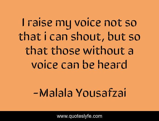 This page presents the quote "I raise my voice not so that i can shout, but so that those without a voice can be heard". Author of this quote is Malala Yousafzai. This quote is about inspirational-attitude, social-justice,.