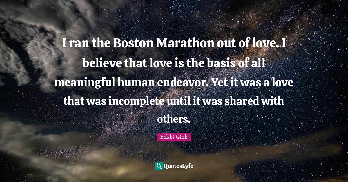 This page presents the quote "I ran the Boston Marathon out of love. I believe that love is the basis of all meaningful human endeavor. Yet it was a love that was incomplete until it was shared with others.". Author of this quote is Bobbi Gibb. This quote is about boston marathon, love, meaningful, endeavor, i believe, ran, believe, love is, incomplete,.