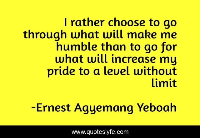 This page presents the quote "I rather choose to go through what will make me humble than to go for what will increase my pride to a level without limit". Author of this quote is Ernest Agyemang Yeboah. This quote is about stay-humble, choose-humility, obedience, wisdom, thought, difficulties, words, humility, difficulties-of-life,.